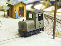Feldbahn-Diesellok Nachbildung einer Gmeinder-Diesellok, angetrieben durch das neue EGGER-BAHN® Universalfahrwerk, fein detaillierter Fahrwerksrahmen und Aufbauten in Messing Feingusstechnologie, geschlossene Führerhaustüren, grüne Farbgebung mit leichten Betriebsspuren und Verwitterungsfinish. Lokomotive mit grauer Fahrwerksschürze und Betriebsnummer 7. Länge über Puffer 43 mm. Gewicht 69 g.